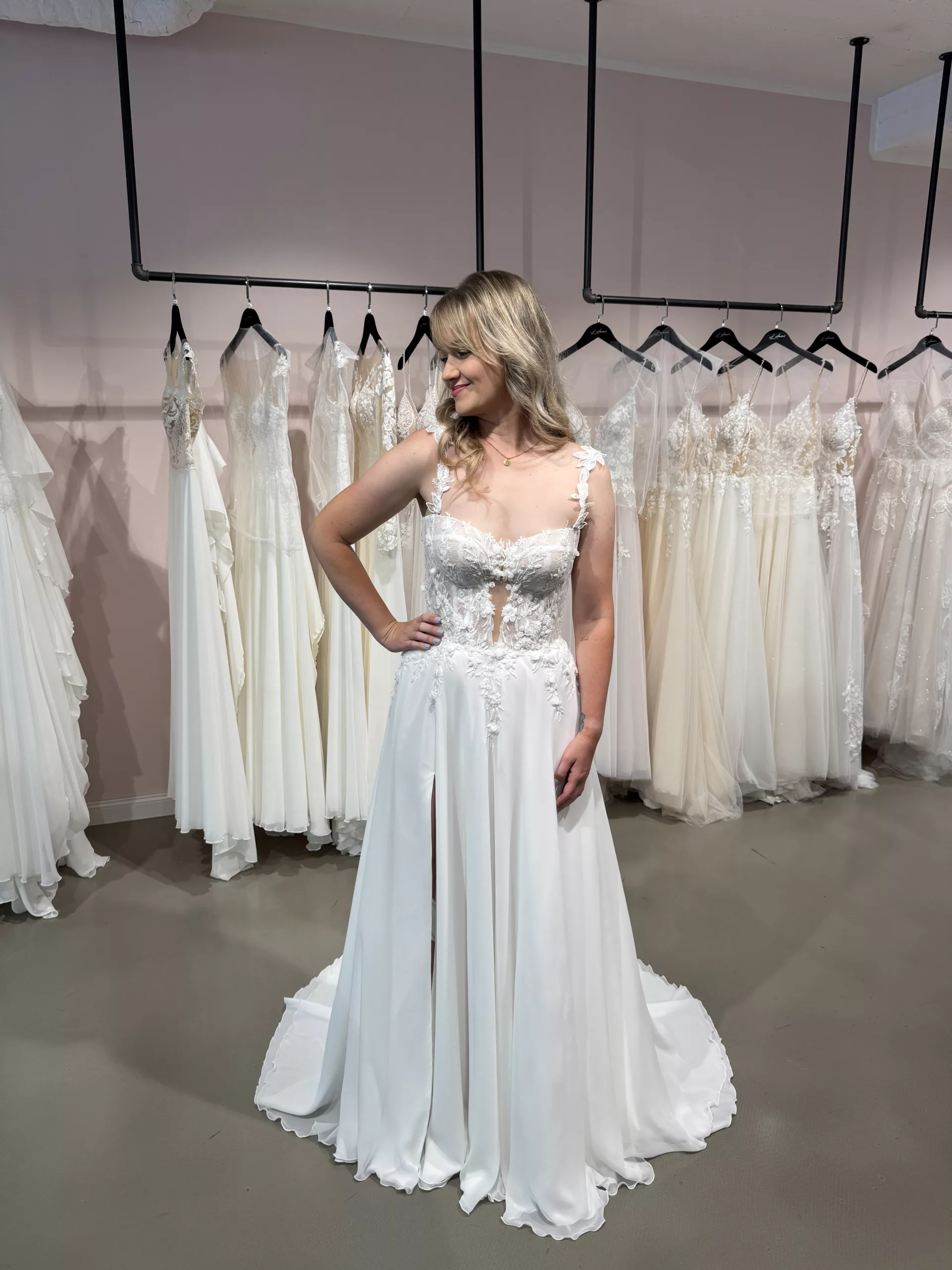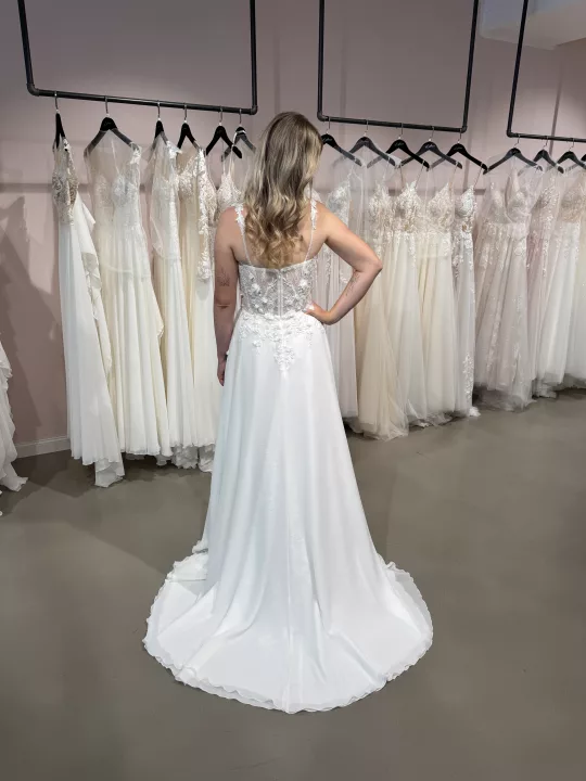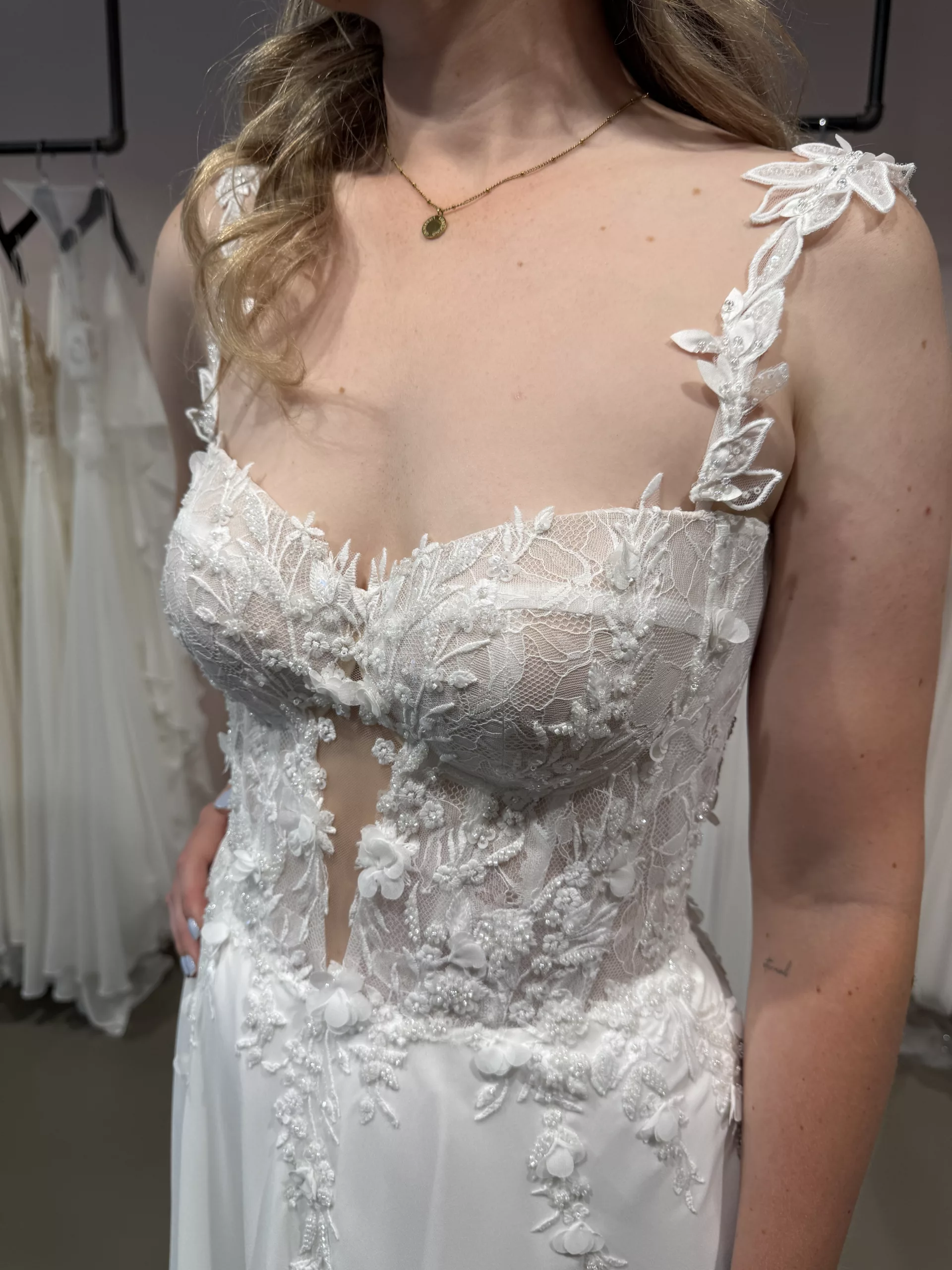 Ein leichtfallendes Chiffonkleid mit einem Oberteil im Lingerie Look bestickt mit 3D Spitze und Perlen, verspielten Trägern und Beinschlitz.