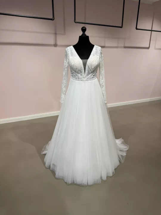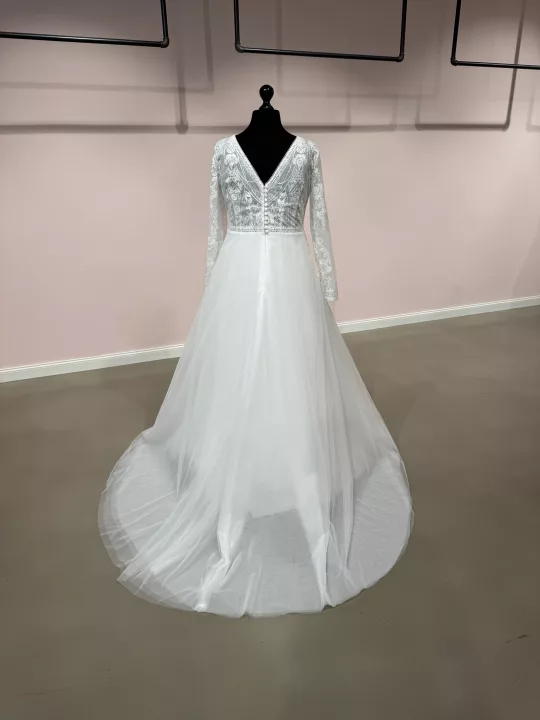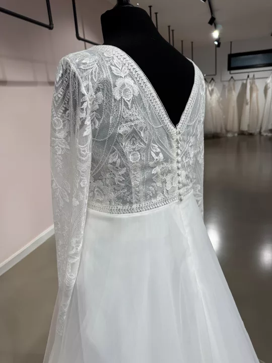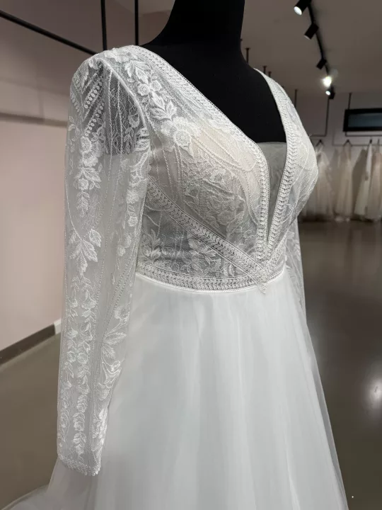 Ein langarm Tüllkleid für Curvies mit floraler und Boho-Spitze verziert. Das Oberteil hat vorne und hinten einen V-Ausschnitt und einen schlichten Soft-Tüllrock mit Beinschlitz.